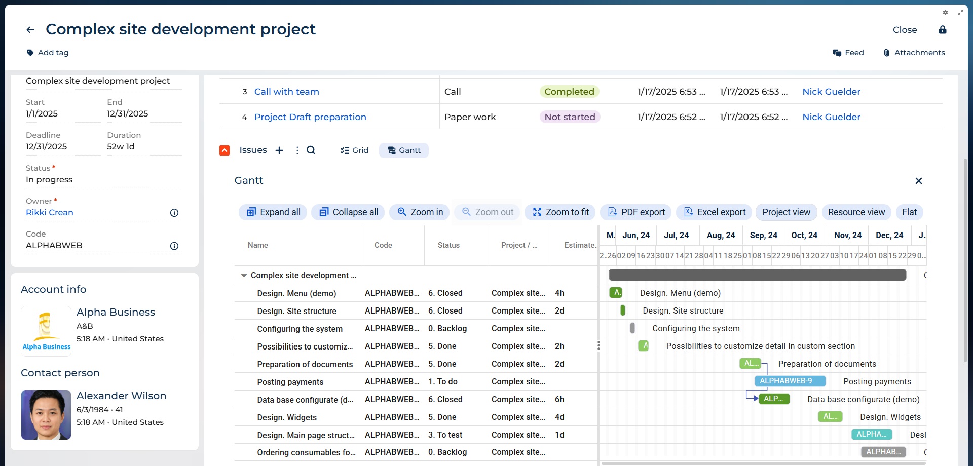 - Gantt Chart component configured for details in Project and Issue sections;