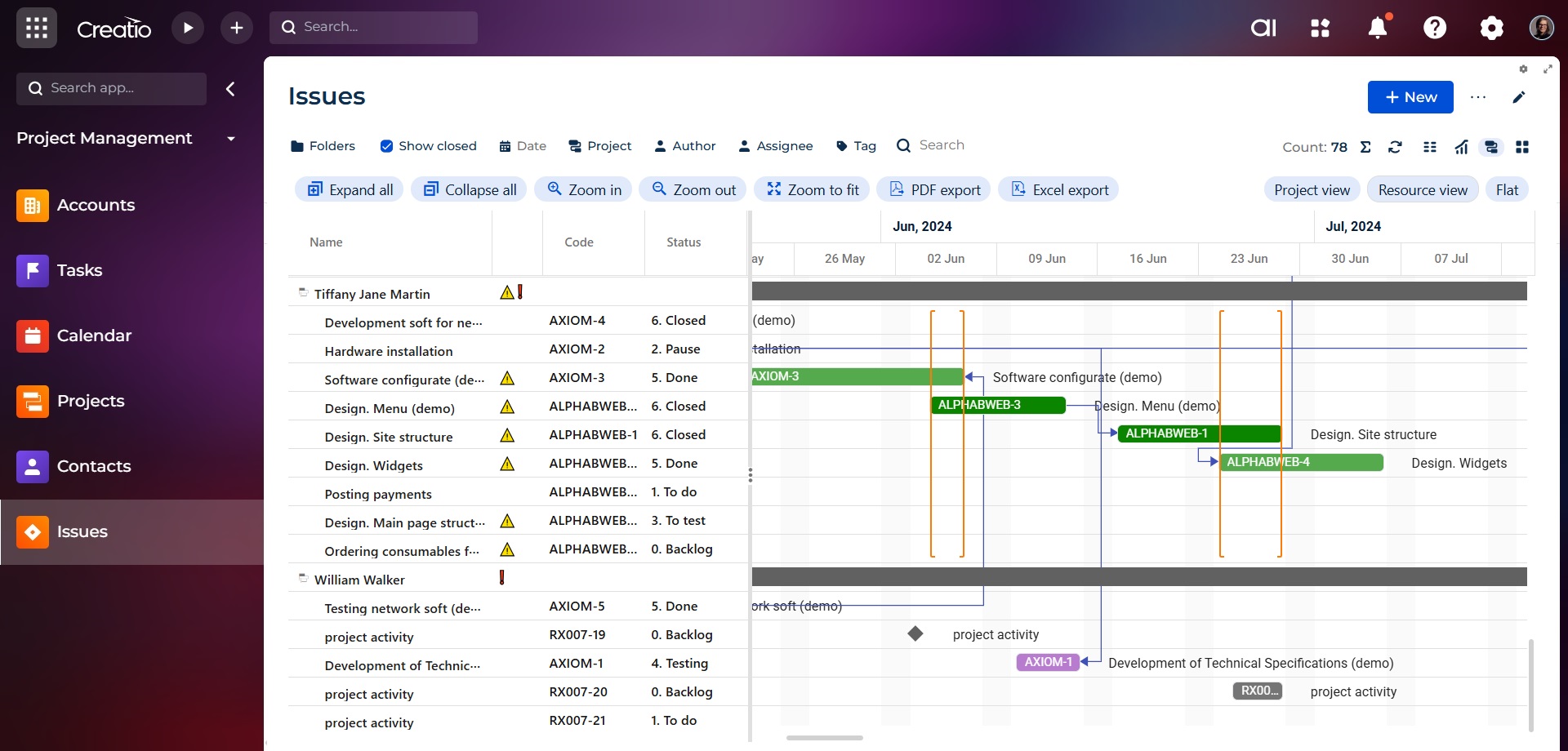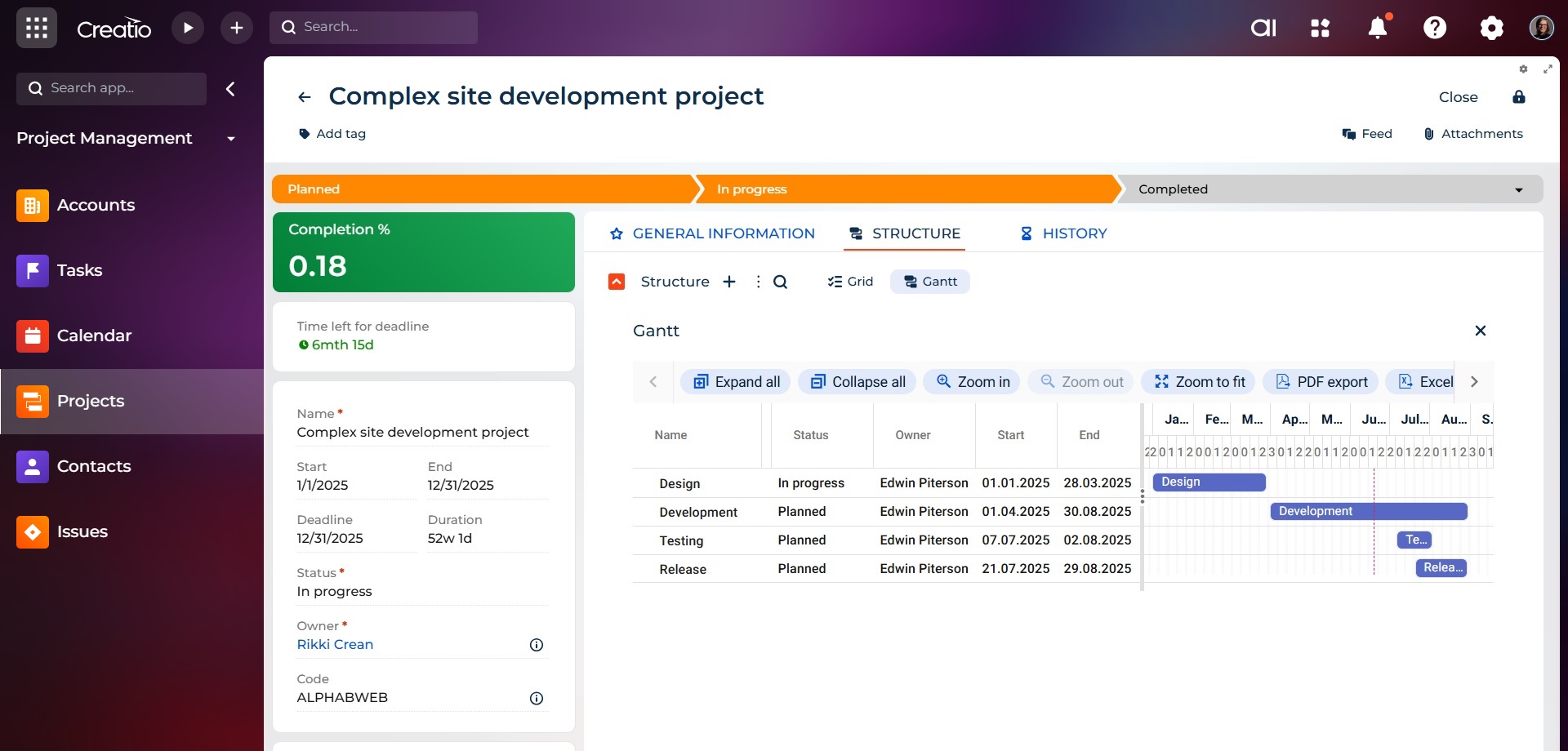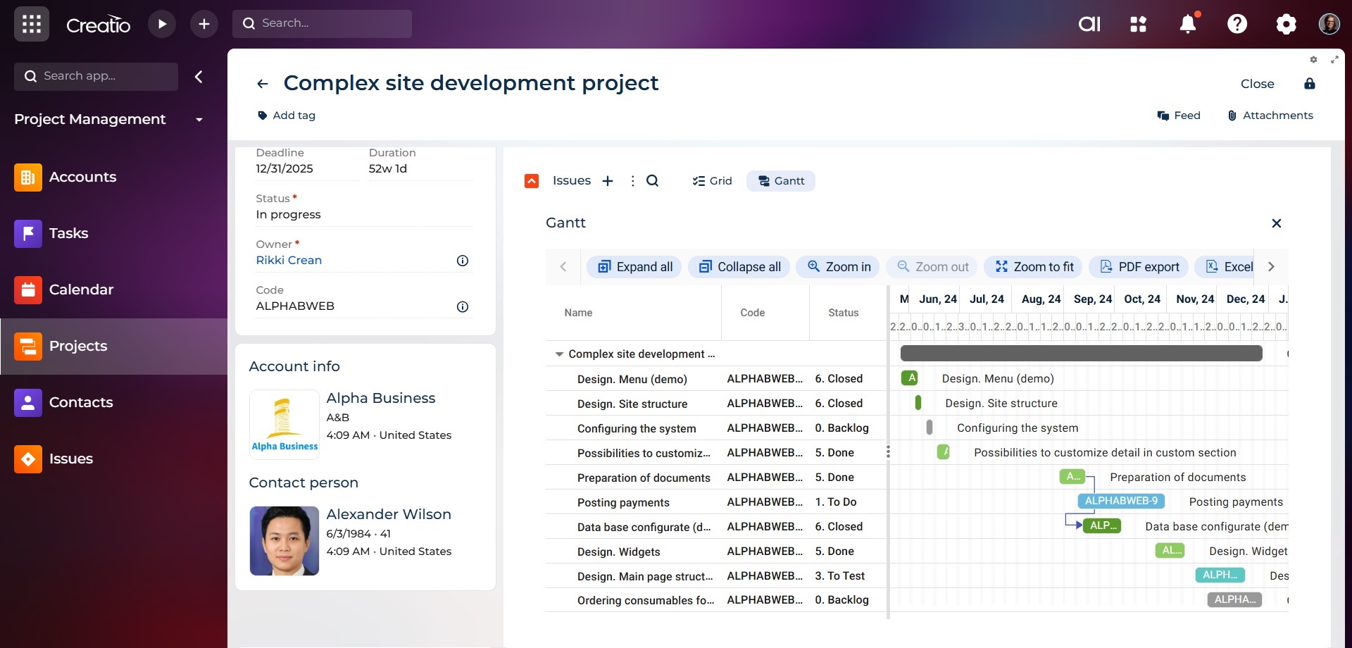 Sales'Up Project Management for Creatio - The product allows you to plan, create and manage project tasks, monitor their progress, respond quickly to deviations from the schedule and changes in the priority of tasks using a convenient view in the form of Gantt chart and Kanban board.