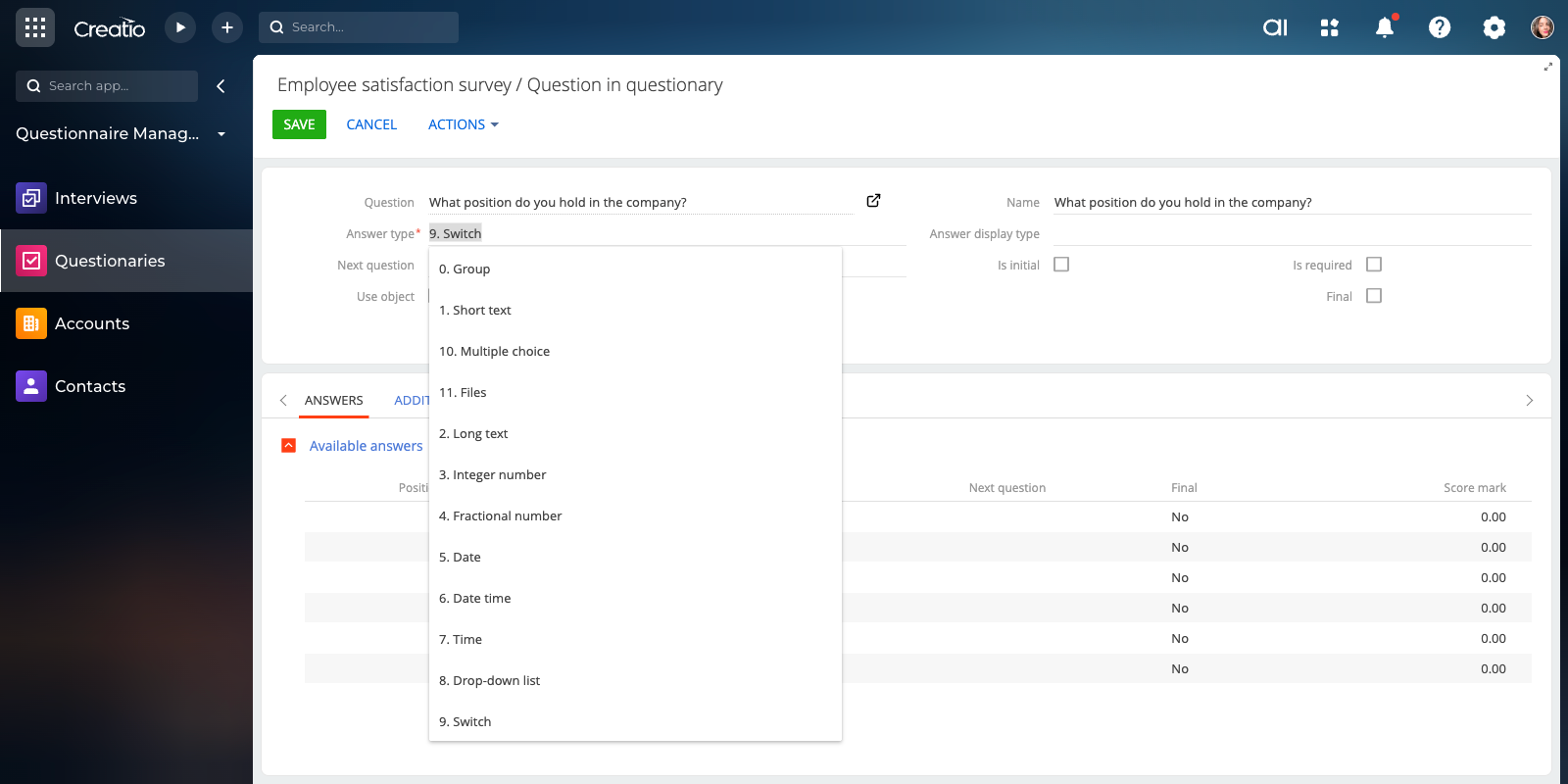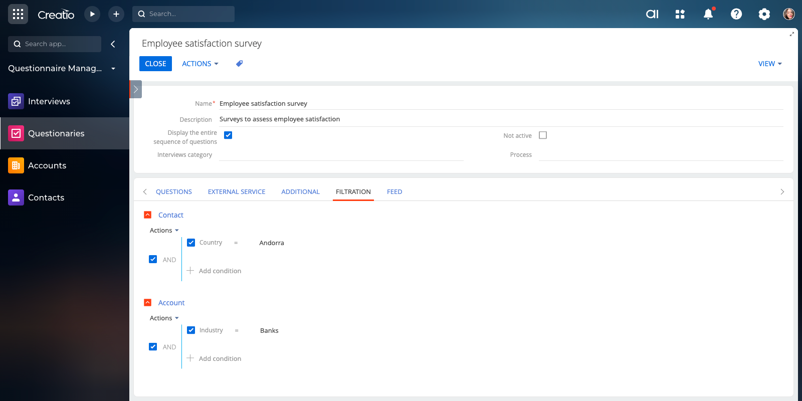 Sales'Up Questionnaire management for Creatio facilitates storing and managing information about surveys and questionnaires in Creatio.