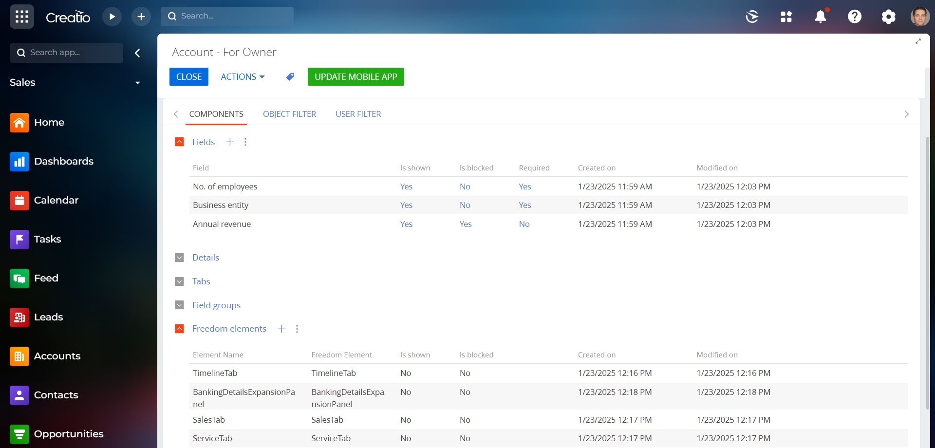 - User-specific component display rule settings are now available on the new Freedom UI pages. At the same time, it is now possible to configure the display of absolutely any components: fields, details, tabs, groups of fields, dashboards, various modules, panels, buttons, etc.
