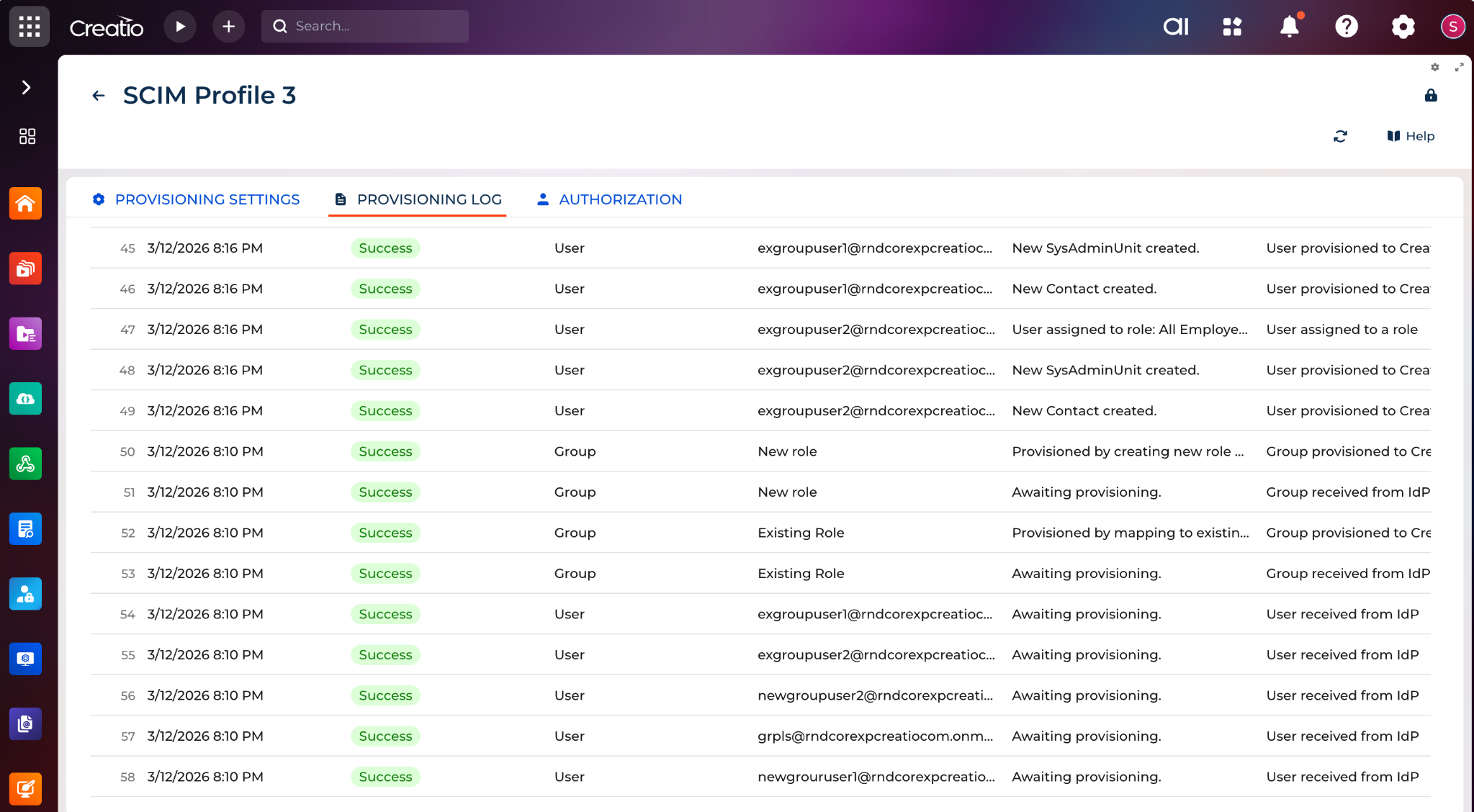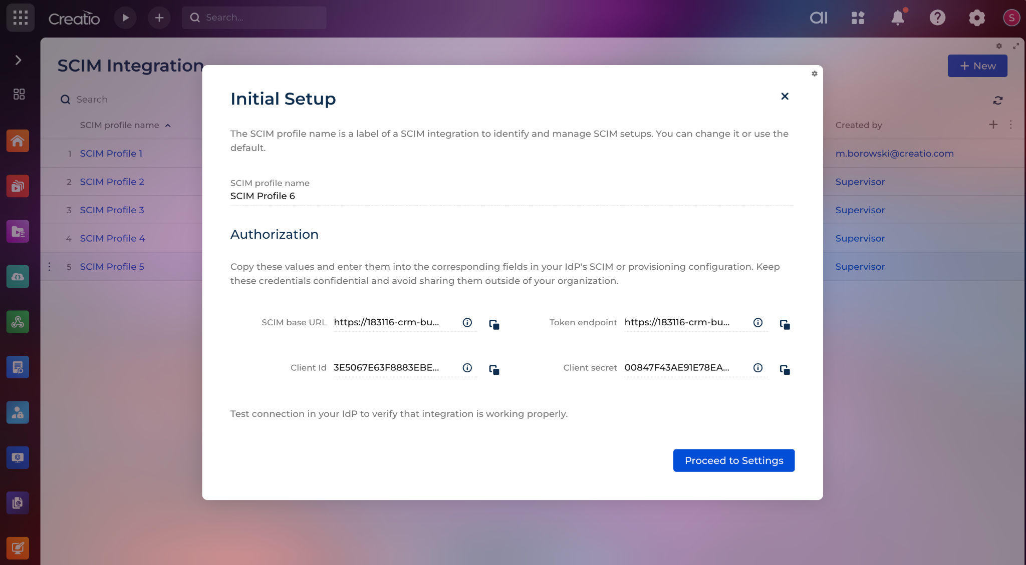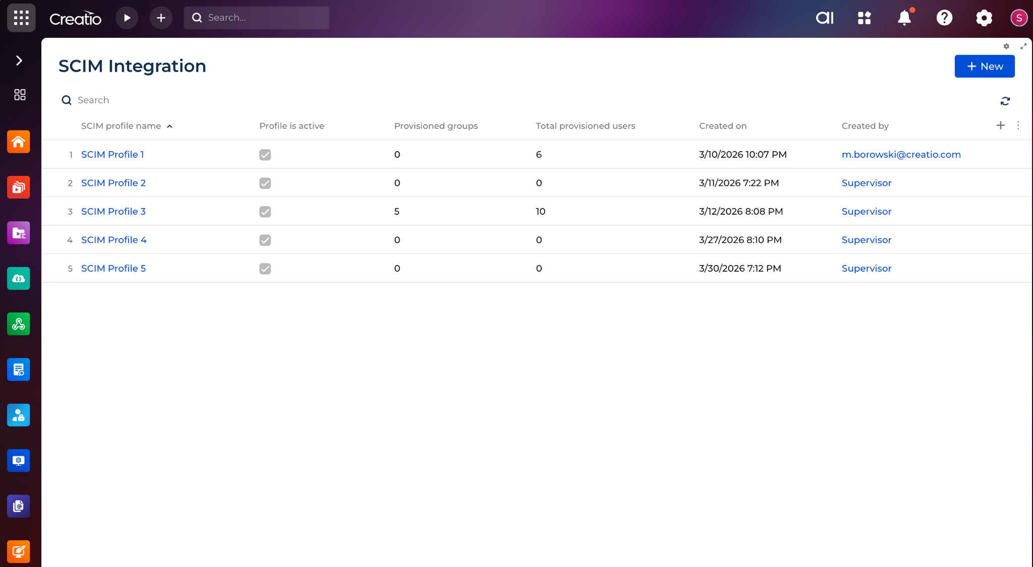 SCIM Integration for Creatio enables user and group provisioning from an identity provider to Creatio through SCIM endpoints. The app provides a SCIM Administration page where administrators can create SCIM profiles, configure authorization, manage provisioning settings, review incoming groups, monitor provisioning logs, and control how external directory data is applied in Creatio.