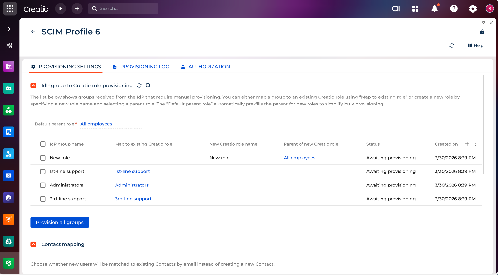 The app supports controlled group-to-role provisioning. Incoming groups are displayed for administrator review before they are provisioned to Creatio roles. Administrators can map an incoming group to an existing role or create a new role during provisioning. Because incoming SCIM groups are processed as a flat structure, the app also supports building a multi-level Creatio role hierarchy by assigning parent roles during manual provisioning.