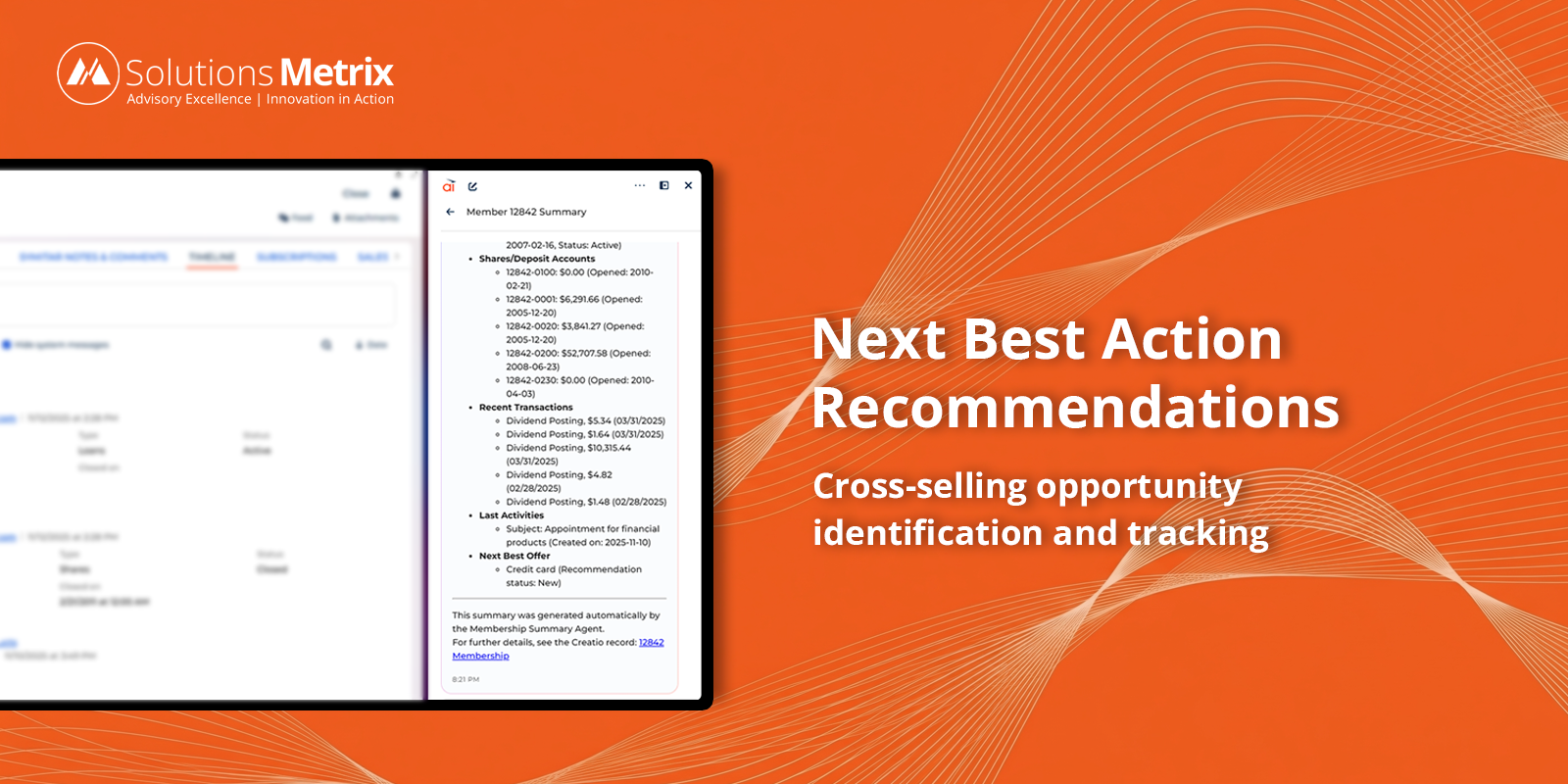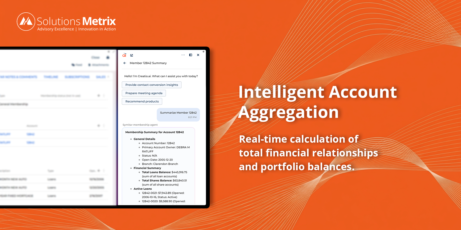 Member Insight Engine for Creatio revolutionizes how credit unions and financial institutions interact with member data. By seamlessly connecting with Symitar core banking systems through our robust connector, this agentic AI solution automatically aggregates and intelligently summarizes comprehensive member information—including account details, loan portfolios, deposit balances, transaction history, and next best actions—into easy-to-read, contextual summaries.