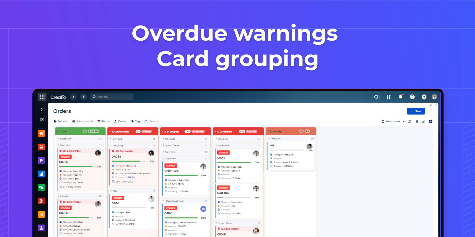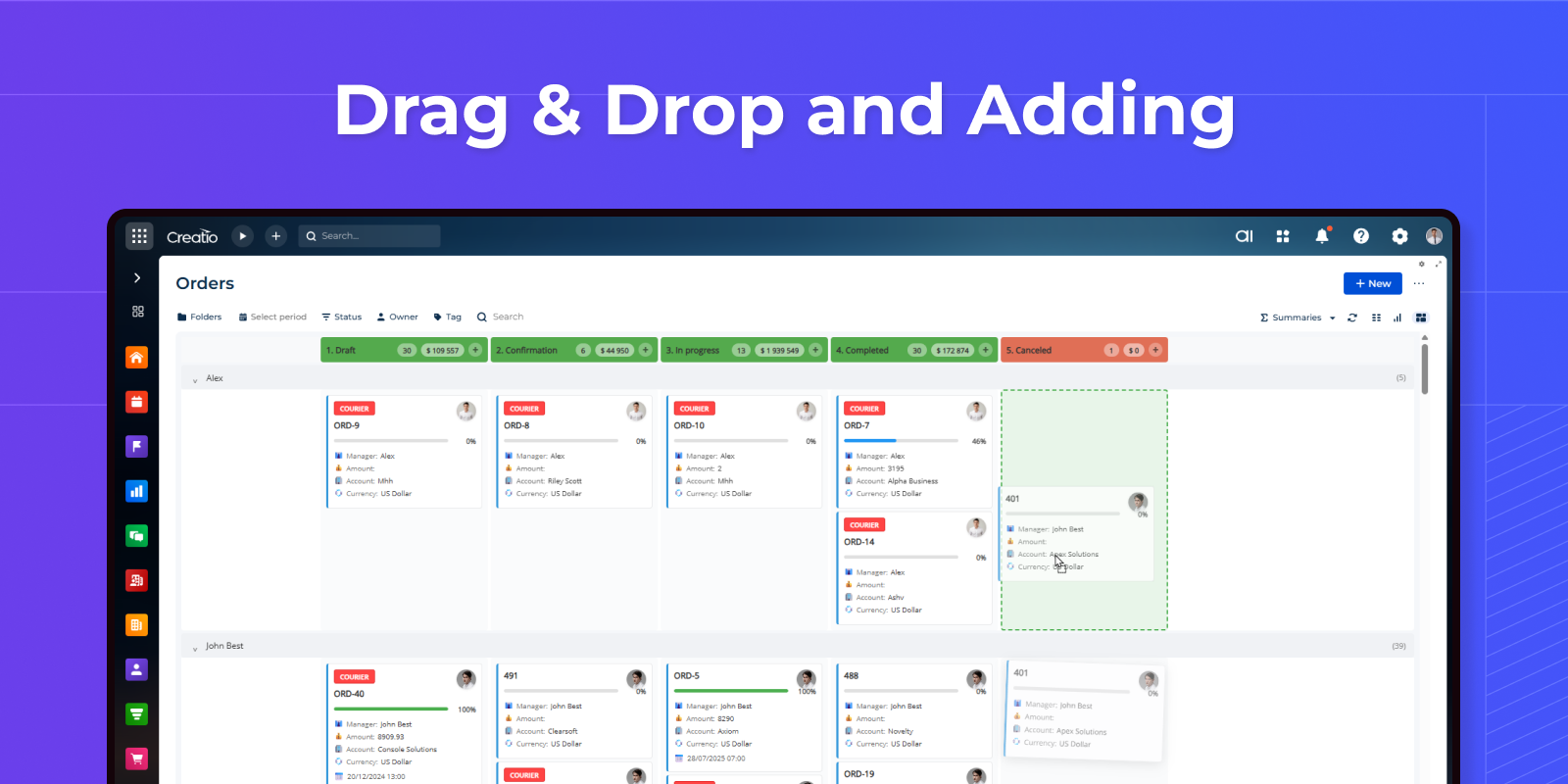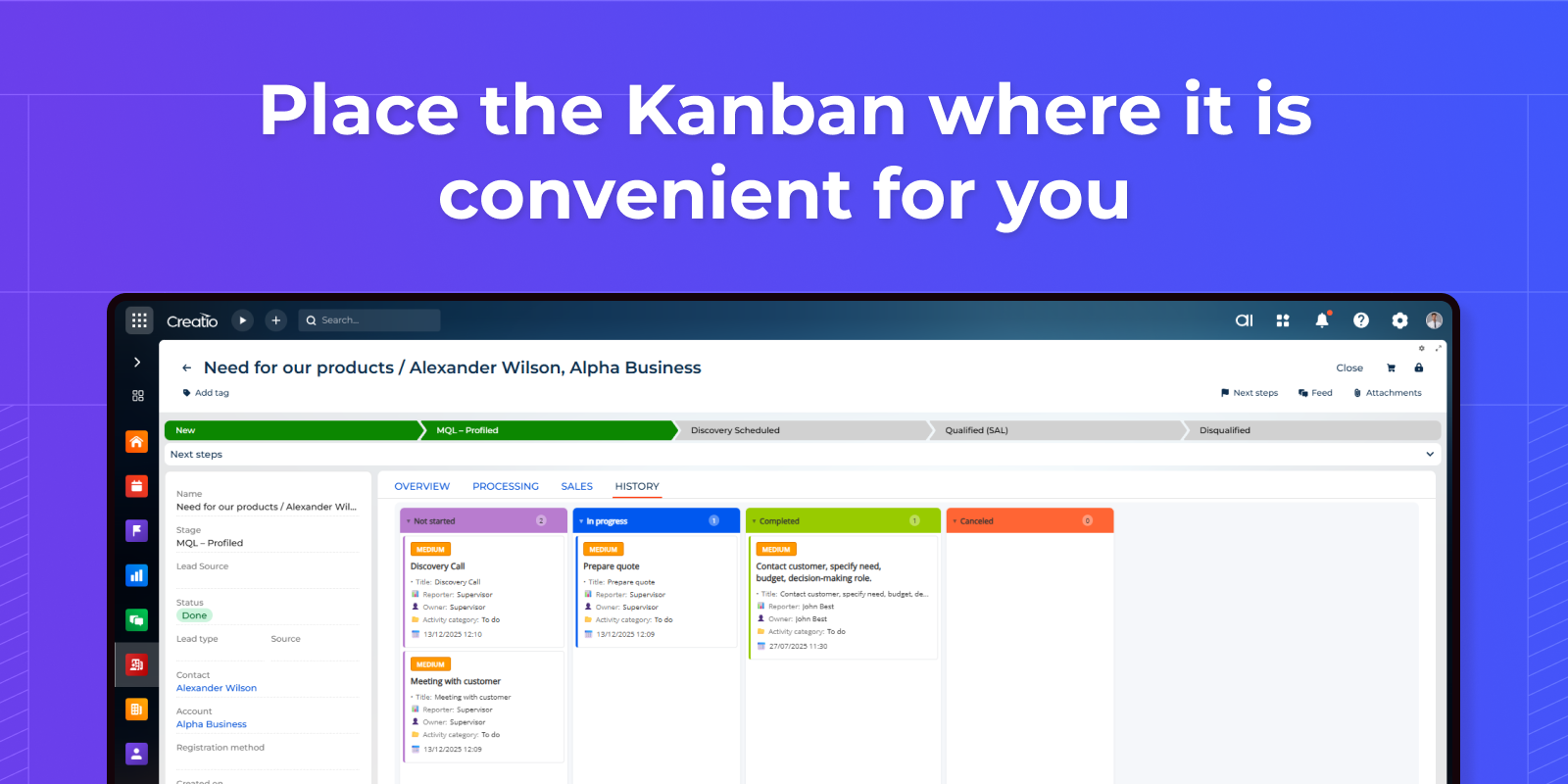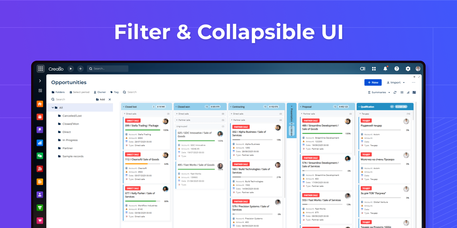 Full integration with Creatio filters — folders, quick filters, and custom filter panels work seamlessly. Place Kanban on detail pages with automatic parent record filtering. Filters update the board in real-time.