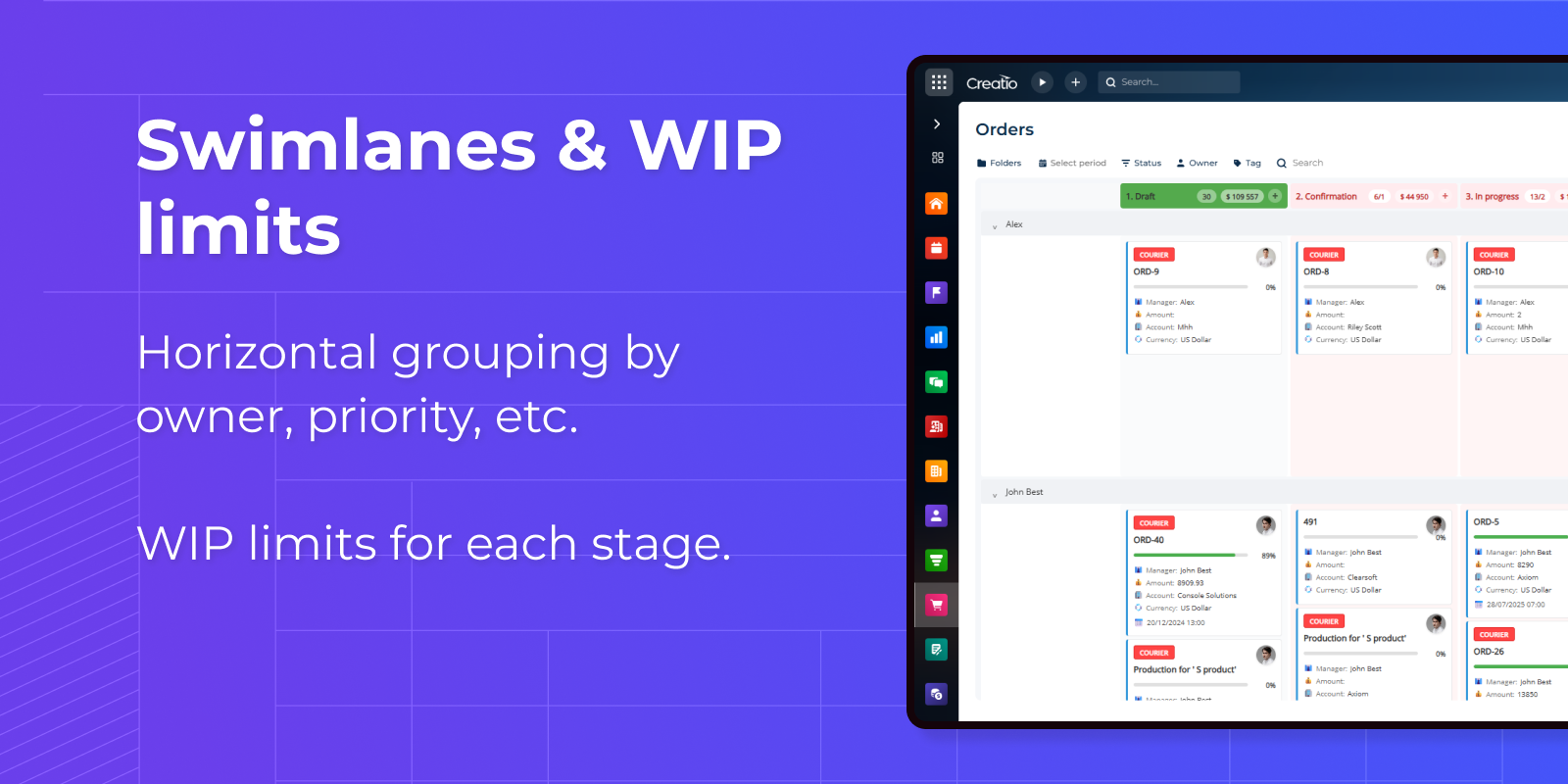 Syntech Kanban View for Creatio is a visual element that streamlines record management by displaying items as cards organized into columns by stage. Features swimlanes, owner avatars, stage totals, progress bars, WIP limits, filters and DCM support.