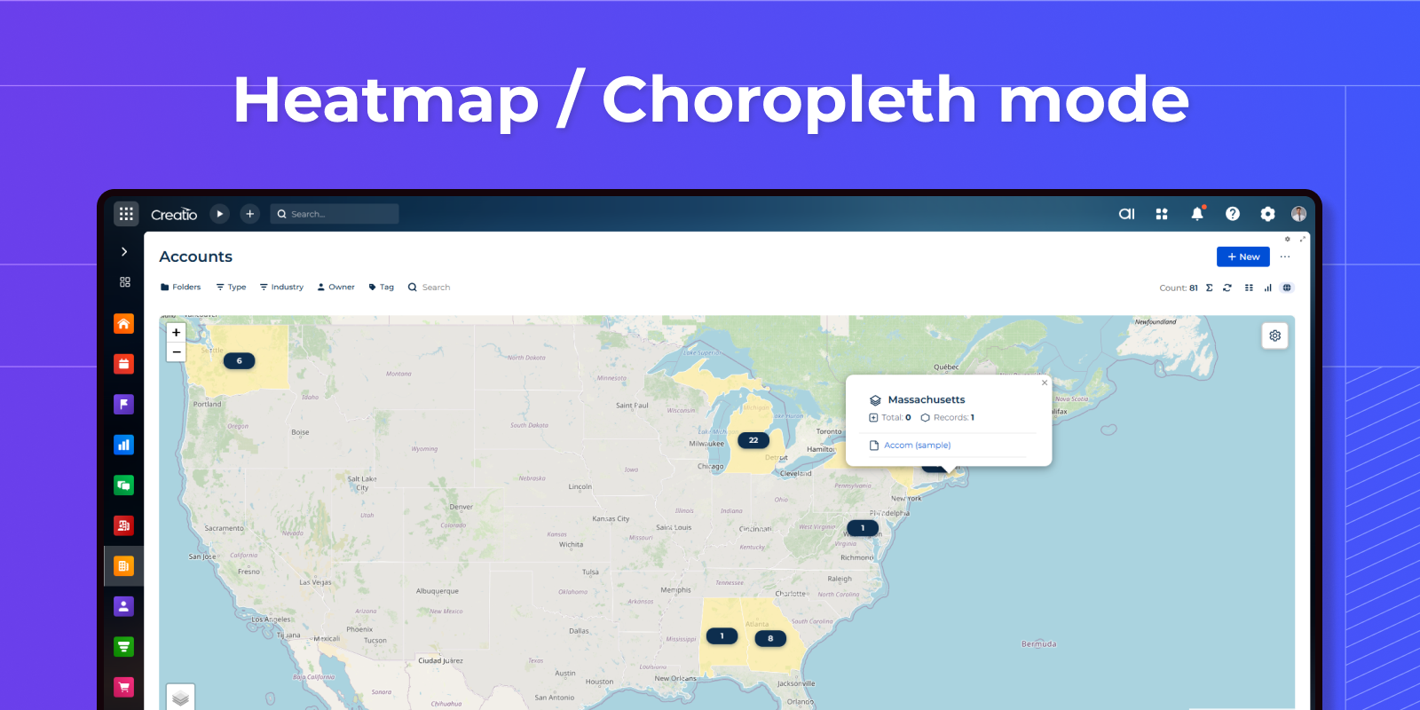 Display color-coded markers with fully customizable popup cards. Configure which columns appear in popups, click marker titles to open records directly in Creatio. Marker colors can be driven by record data.