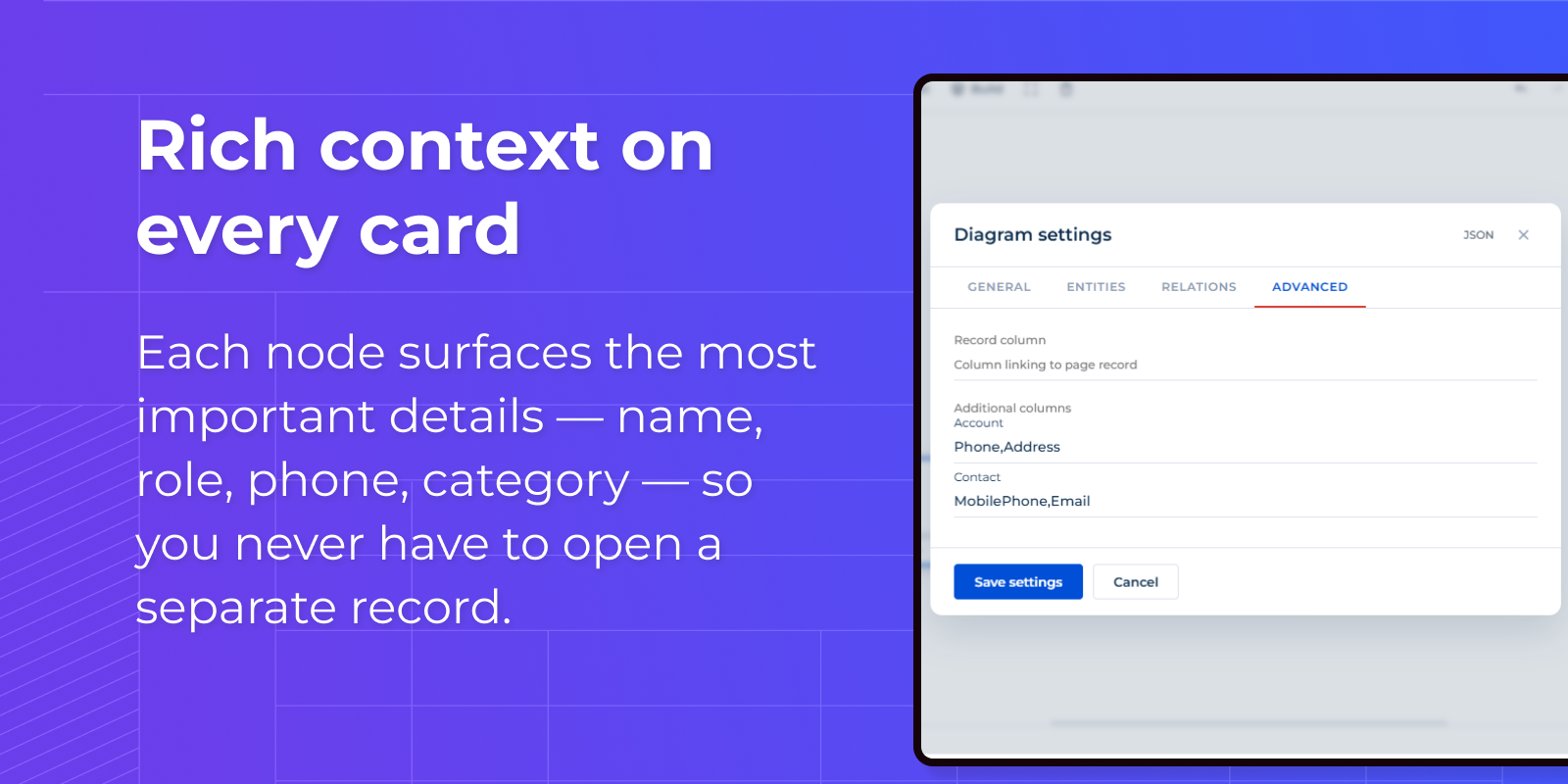 See the full picture of any account, contact, or deal at a glance. The interactive diagram automatically maps related entities — contacts, opportunities, contracts, activities — directly on the record page, revealing how your business relationships connect.