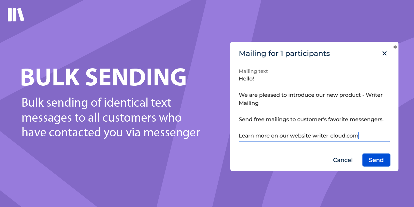 Writer Mailing enhances Writer Operator by enabling users to send mass broadcast messages to all clients who have previously initiated conversations via channels like Telegram, Viber, WhatsApp, Instagram and other.
